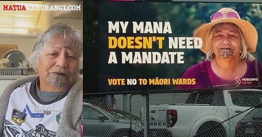 In the latest instalment of people outraged by things they clearly don’t understand, Aukaha News and a woman named Ellen Tamati have launched a social media tantrum over a billboard image used by Hobson’s Pledge in one of their campaign against Māori Wards.