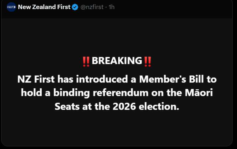 BREAKING: NZ First introduces bill for binding referendum on Māori seats at 2026 election