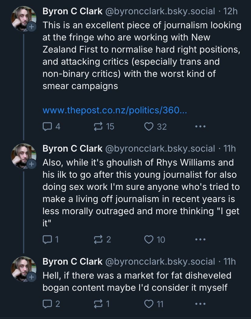 In what should surprise absolutely no one, Byron C. Clark, telemarketer-turned-activist and the self-published author of the fiction novel Fear, has taken to Bluesky Social to cheerlead for yet another character assassination campaign against figures like Winston Peters, Rhys Williams, Sean Plunket, Vlad Barbalich, Cam Slater and the broader NZ First movement. This time, he is proudly championing a hit-piece penned by Andrea Vance and Charlie Mitchell.
