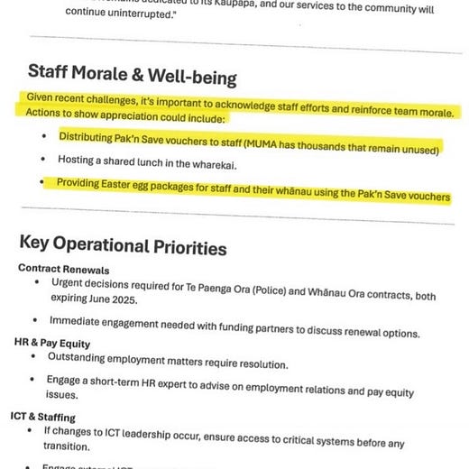 The documents suggest the unused Pak’n Save vouchers were considered for staff morale boosters and even floated as Easter egg packages for staff and their whānau. What a whākn’ joke. Publicly funded assistance intended for struggling households, casually repurposed as internal perks.